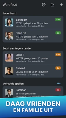 Verbinding en interactie staan centraal in Wordfeud. Blijf naadloos op de hoogte van de zetten van je tegenstanders door middel van handige notificaties en duik direct terug in de actie. De geïntegreerde chatfunctie maakt het eenvoudig om te communiceren: feliciteer elkaar met een briljante zet, deel een kwinkslag of plaag je rivaal strategisch. Met ondersteuning voor een breed scala aan woordenboeken, waaronder Nederlands, Engels, Duits, Spaans, Portugees, Frans, Noors, Zweeds, Deens en Fins, overstijgt Wordfeud culturele grenzen en verenigt het taalliefhebbers over de hele wereld in één intelligent spel.
